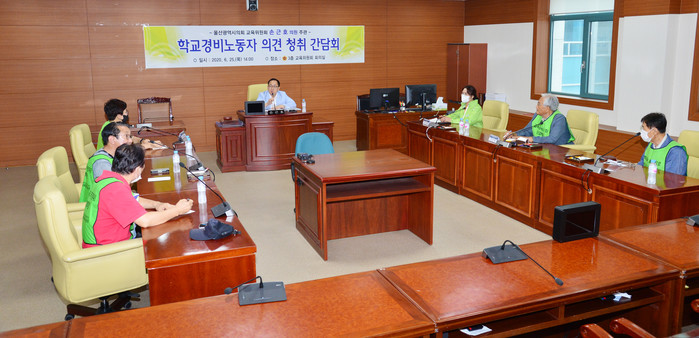 울산시의회 손근호 의원은 최근 시의회 3층 교육전문위원실에서 교육공무직노조 울산지부 임원진과 학교 경비원 등 6명이 참석한 가운데 학교 경비원 고용안정 관련 의견을 청취했다. 사진은 간담회가 진행되는 모습. (사진제공=울산시의회)