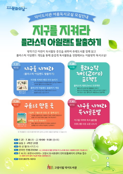 [고양=이기홍 기자] 고양시 덕이도서관은 여름방학을 맞이해 오는 7월 27일부터 30일까지 독서교실 ‘지구를 지켜라! 플라스틱 아일랜드 탈출하기’를 운영한다.