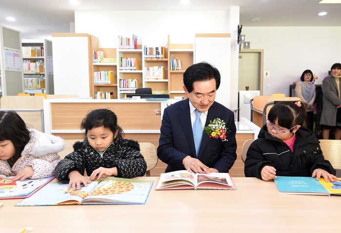 | ▲ 육아종합지원센터 개관식에 참석한 안병용 시장이 도서관에서 아이들과 함께 책을 보고 있다. (사진제공=의정부시청) |