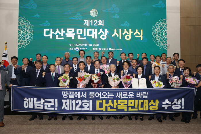 | ▲ 지난 19일 열린 '다산목민대상 시상식'에서 명현관 군수가 수상자들과 함께 기념촬영을 하고 있다. (사진제공=해남군청) |