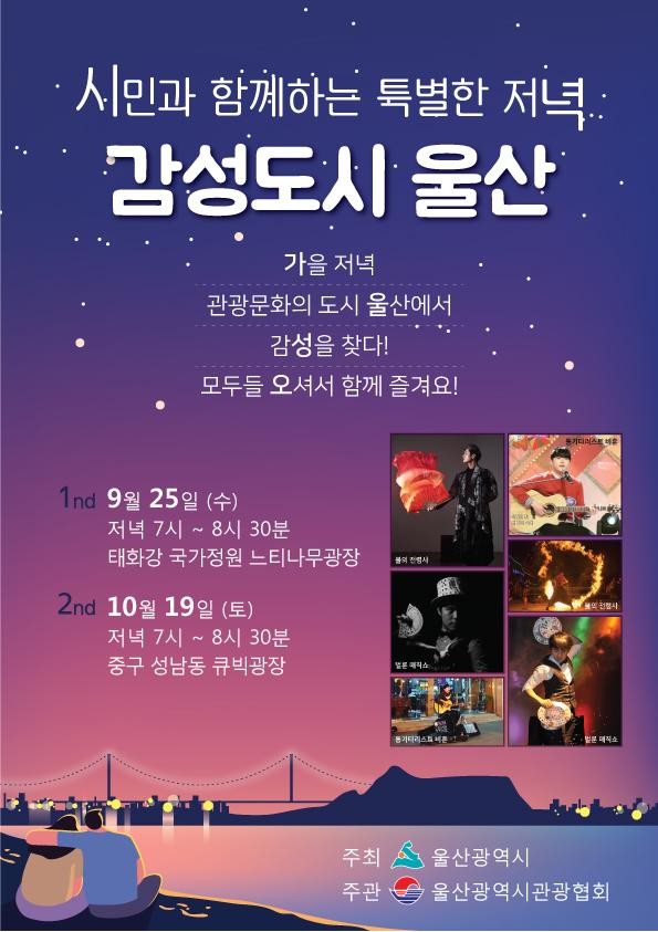 울산시 관계자는 “야간에 즐길 수 있는 관광콘텐츠를 개발하여 체류형 관광객을 유도하기 위해 이번 행사를 마련했다. 시민들과 울산을 찾는 관광객들에게 가을밤의 정취를 느낄 수 있는 공연이 되기를 기대한다. 앞으로도 다양한 문화관광 프로그램을 개발에 최선을 다해 나갈 것.”이라고 전했다.