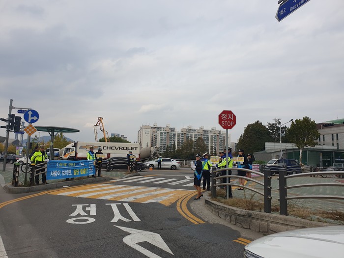 인천삼산경찰서는 지난 28일 부평구 부평구청 사거리 교차로에서 부평경찰서와 합동으로 교통안전계장 및 교통경찰관 협력단체인 녹색어머니회, 모범운전자회 등 약 40여명이 함께 '사람이 보이면 일단 멈춤! 속도를 줄이면 사람이 보입니다' 교통 캠페인을 전개했다. 사진은 참여자들이 캠페인을 진행하는 모습. (사진제공=인천삼산경찰서)