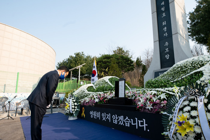 이용범 인천시의회 의장은 16일 세월호 참사 6주기를 맞아 인천가족공원 세월호 추모관 앞에서 희생자의 넋을 기리는 추모식에 참석했다. 사진은 이 의장이 참배하는 모습. (사진제공=인천시의회)