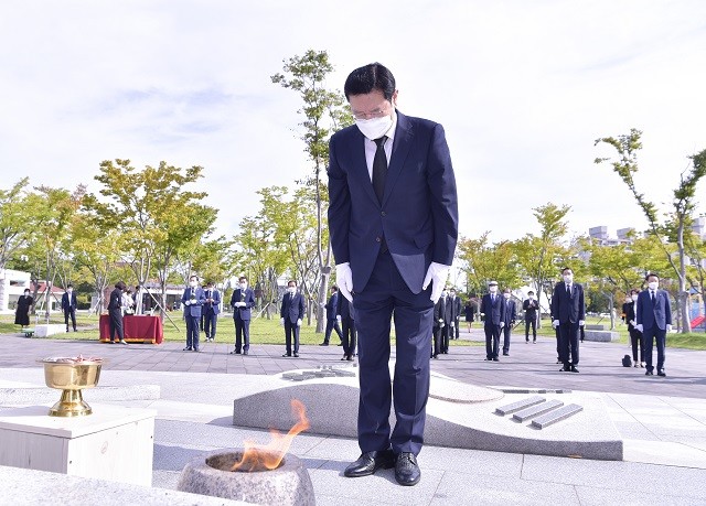 [광주=정찬남 기자]이용섭 광주광역시장이 제76주년 광복절을 맞아 15일 오전 서구 상무시민공원 내 광주독립운동기념탑을 찾아 참배를 하고 있다./광주광역시 제공