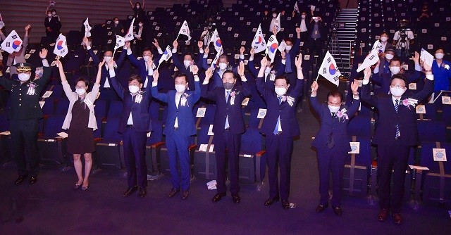 이용섭 광주광역시장(앞줄 우측부터 3번)이 15일 오전 시청 대회의실에서 열린 제76주년 광복절 경축식에 참석해 김용집 광주시의회의장, 국회의원, 구청장, 광복회원 등 내빈들과 만세삼창을 하고 있다.
