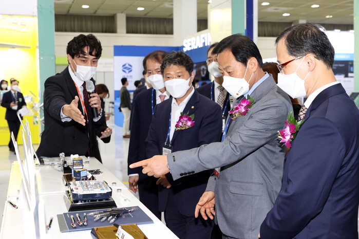 장현국 경기도의회 의장이 지난 25일 코엑스에서 열린 'GAMEX(치과기자재전시회) 2021 개회식'에 참석했다. 경기도치과의사회가 주최하고 경기도치과의사회 GAMEX 조직위원회가 주관한 이번 행사에는 박태근 대한치과의사협회 협회장, 서영석 국회의원, 최유성 경기도치과의사회 회장 등이 참석했다. 사진은 전시회를 둘러보는 장 의장(오른쪽 두 번째)의 모습. (사진제공=경기도의회)