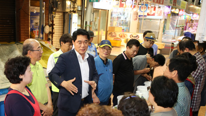 | ▲ 지난 7월 신원시장 단합회에 참석한 박준희 구청장이 상인들과 소통하고 있다. (사진제공=관악구청) |