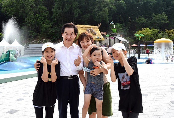 | ▲ 안병용 시장(왼쪽 두 번째)이 지난해 추동공원 물놀이장을 찾은 가족들과 기념촬영을 하고 있다. (사진제공=의정부시청) |