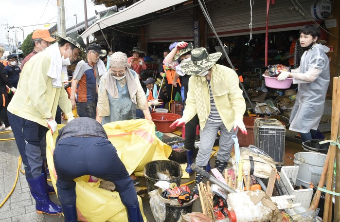 행정구역을 떠나 피해가 심각했던 구례5일장을 찾은 순천시의회 의원들은 지붕까지 물이 차올랐던 상점에서 물건을 꺼내 일일이 씻고 쓰레기를 치우는 등 복구에 구슬땀을 흘렸다.