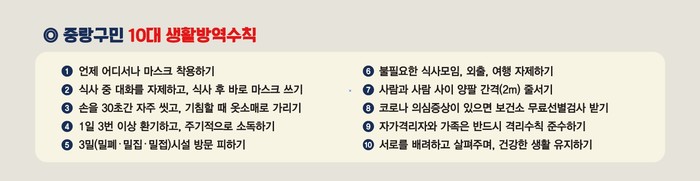 중랑구민 10대 생활방역수칙은 ▲언제 어디서나 마스크 착용하기 ▲식사 중 대화 자제하고, 식사 후 바로 마스크 쓰기 ▲손을 30초간 자주 씻고 기침할 때는 옷소매로 가리기 ▲1일 3번 이상 환기하고, 주기적으로 소독하기 ▲3밀(밀폐·밀집·밀접)시설 방문 피하기 ▲불필요한 식사 모임, 외출, 여행 자제하기 ▲사람과 사람 사이 양팔 간격(2m) 줄서기 ▲코로나 의심증상이 있으면 보건소 선별검사 받기 ▲자가격리자와 가족은 반드시 격리수칙 준수하기 ▲서로를 배려하고 살펴주며, 건강한 생활 유지하기 등이다.