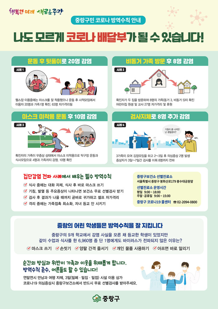 특히, 확진 학생이 발생한 중랑구 9개 학교에서 감염 사실을 모른 채 등교한 학생이 있었지만, 함께 수업과 식사를 한 6960명 중 단 한 명의 추가 확진이 없었던 사례도 소개해, 중랑의 어린이들에게 배우는 생활 속 방역수칙도 함께 알릴 방침이다.