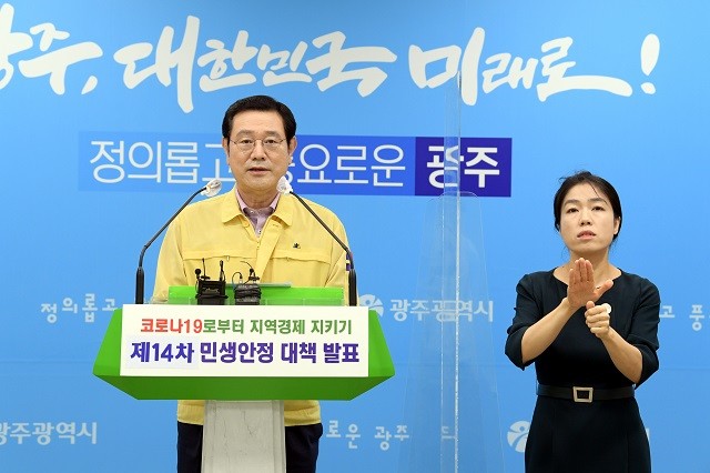 | ▲ 이용섭 광주광역시장이 2일 오후 시청 브리핑룸에서 '코로나19 위기극복을 위한 제14차 민생안정대책'을 발표하고 있다./광주광역시 제공 |