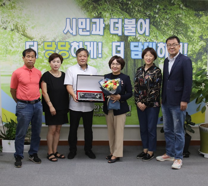 경기 안양시의회 김선화 의장은 29일 안양시 소상공인연합회로부터 지역경제 활성화에 힘써온 공로를 인정받아 감사패를 받았다. 사진은 감사패를 받은 김 의장(왼쪽 네 번째)이 소상공인연합회 관계자 등과 기념촬영을 하는 모습. (사진제공=안양시의회)