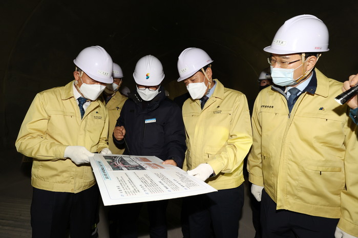 장현국 경기도의회 의장이 최근 수도권 광역급행철도(GTX)-A노선 성남역 공사현장을 찾아 겨울철 안전사고 예방에 만전을 기할 것을 당부하는 등 현장 소통형 의정활동을 실시했다. 사진은 공사 현장관계자로부터 브리핑을 듣고 있는 장 의장과 관계자들의 모습. (사진제공=경기도의회)