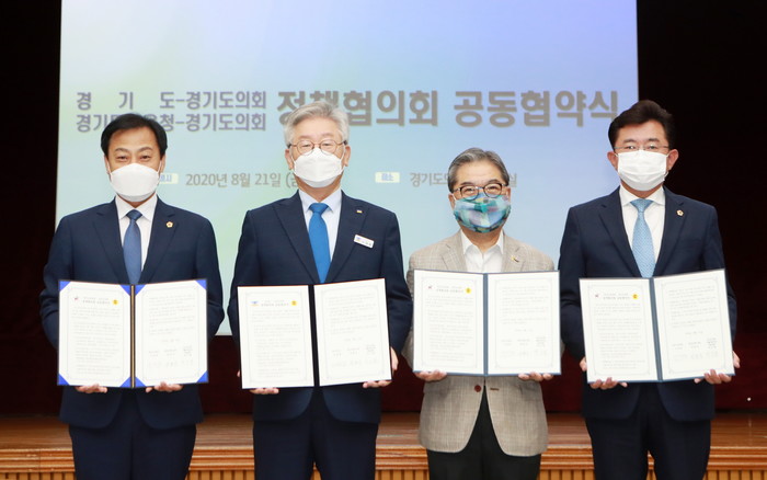 도의회와 도, 도교육청은 최근 의회 1층 대회의실에서 장현국 의장(더불어민주당·수원7)과 박근철 더불어민주당 대표의원(민주당·의왕1), 이재명 경기도지사, 이재정 경기도교육감이 참석한 가운데 ‘정책협의회 공동협약식’을 개최하고 기관 간 협약을 각각 체결했다.