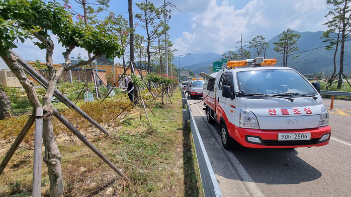 관수와 함께 물주머니 1000여개를 설치하는 한편 도로변 교통안전시설물의 시야를 방해하는 가로수는 가지치기와 제초작업도 추진한다.