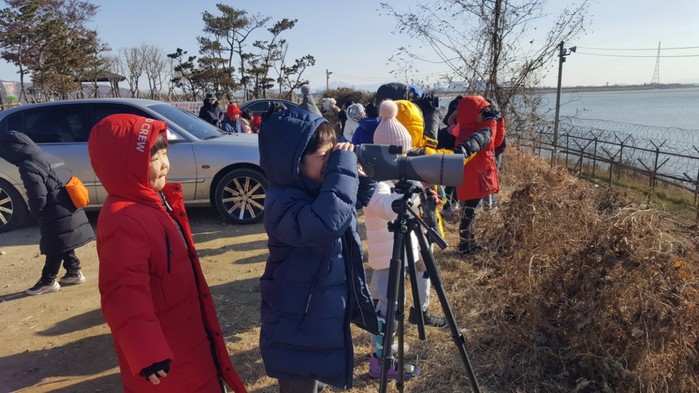 | ▲ 야외학습에 참가한 아이들이 망원경을 이용해 강 건너를 살펴보고 있다(2019년 사진). (사진제공=김포시청) |
