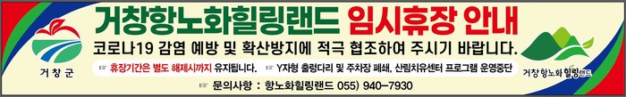 거창군은 14일 코로나19로 인한 수도권 및 국내 감염 전파가 위험수준에 도달함에 따라 지역사회 감염 전파 방지 및 군민들의 안전을 위해 코로나19상황 안정 시까지 항노화힐링랜드 휴장기간을 연장하기로 결정했다.