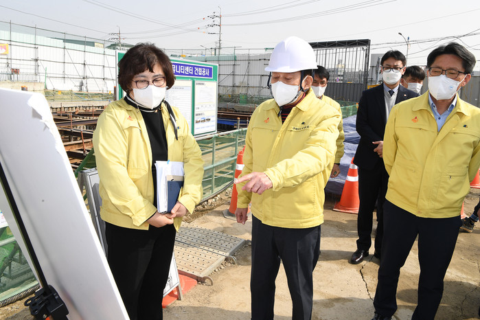 | ▲ 복합커뮤니센터 공사 현장을 방문한 유천호 군수가 관계자들과 현장을 둘러보며 이야기를 나누고 있다. (사진제공=강화군청) |