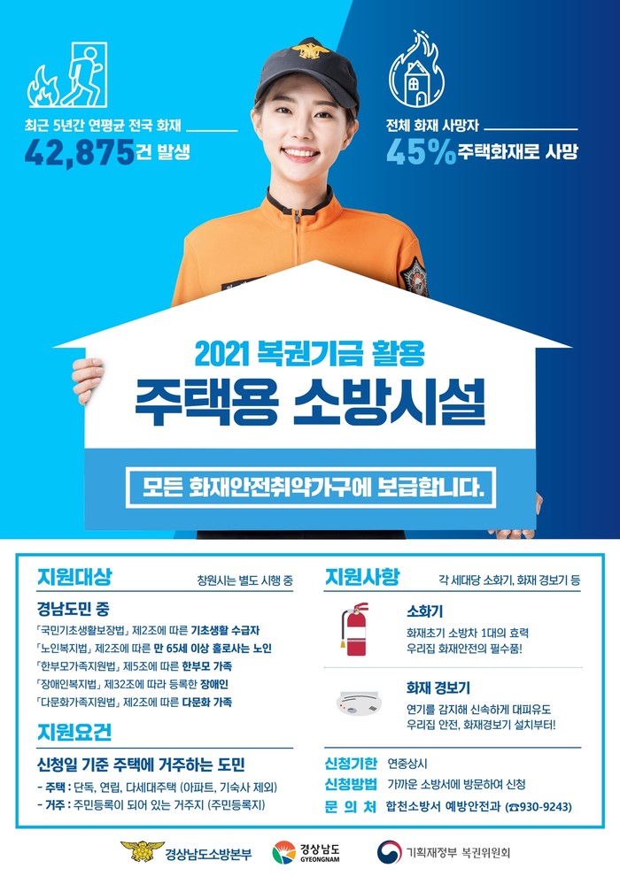 이번 무상보급 사업은 경남소방본부가 2021년 복권기금사업에 ‘취약계층 주택용 소방시설 보급’을 신청해 확보한 국비 79억100만원을 바탕으로 진행된다.