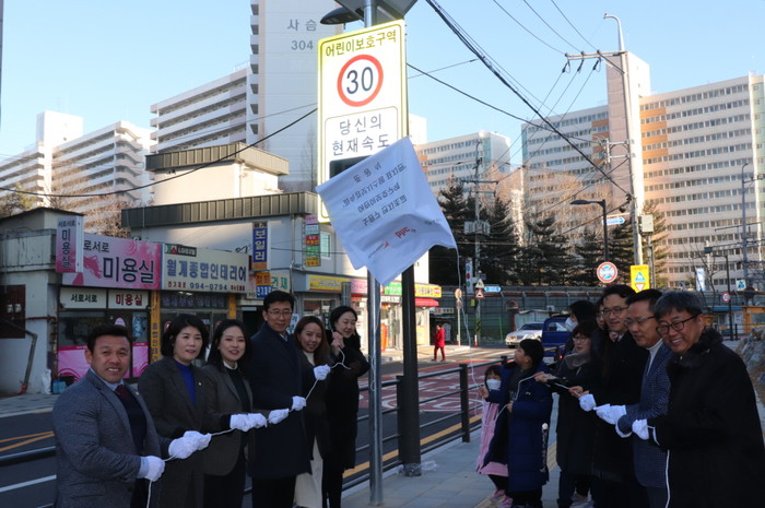 bhc치킨은 첫 설치 지역으로 서울시 노원구를 선정하고, 지난 5일 노원구 소재 연지초등학교 어린이 보호구역(초안산로2라길)에서 과속경보시스템 표지판 제막식을 열었다.