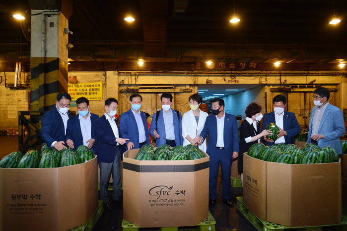 서울시의회 기획경제위원회는 최근 중국 베이징 도매시장에서 코로나19 확진자가 발생해 비상이 걸린 상황에서 가락시장을 방문해 긴급 안전 점검을 진행했다. 사진은 가락시장을 방문한 의원들이 방역 대책 등을 점검하고 있는 모습. (사진제공=서울시의회)