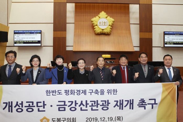 | ▲ 이태용 의장(오른쪽에서 네 번째)과 의원들이 개성공단·금강산 관광 재개를 촉구하고 있다. (사진제공=도봉구의회) |