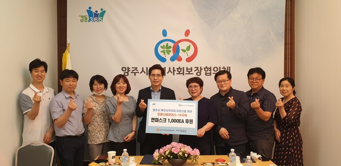 경기 양주시사회적경제협의회와 양주시지역사회보장협의체가 양주시 사각지대 발굴 및 지원강화를 위한 업무협약(MOU)을 맺고, 면마스크 1000장 전달식을 개최했다. 사진은 전달식 후 기념촬영을 하고 있는 관계자들의 모습. (사진제공=양주시청)