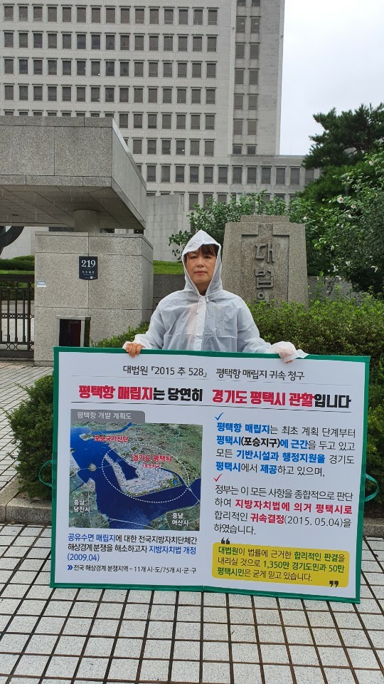 [수원=채종수 기자] 경기도의회 김영해 의원(더불어민주당·평택3)이 최근 대법원 앞에서 평택항 매립지의 평택시 귀속 촉구 1인 피켓시위에 나섰다.