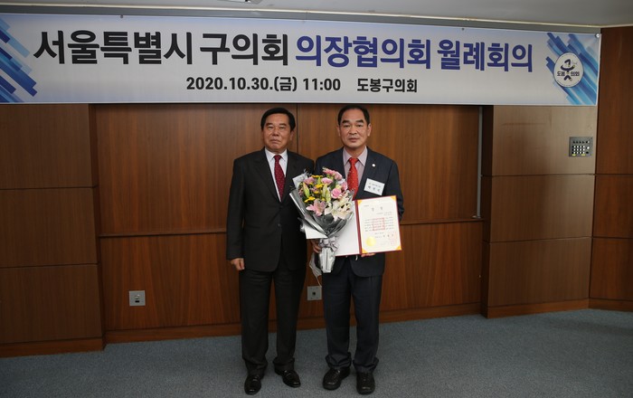 | ▲ 국회의장 표창을 받은 박진식 의장(오른쪽)이 조영훈 의장협의회장과 기념촬영을 하고 있다. (사진제공=도봉구의회) |