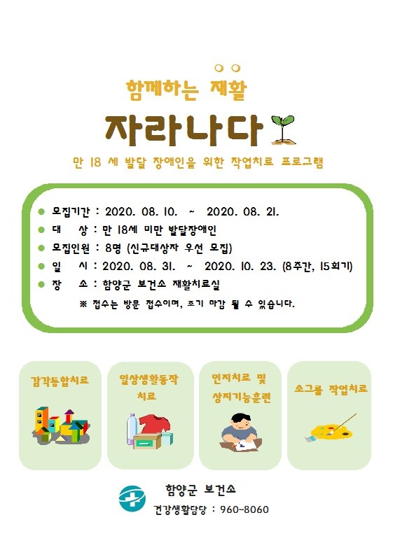 함양군은 관내 거주하는 만 18세 미만 발달장애인을 대상으로 군 보건소 재활치료실에서 오는 31일부터 ‘함께하는 재활, 자라나다’작업치료 프로그램을 운영한다고 11일에 밝혔다.