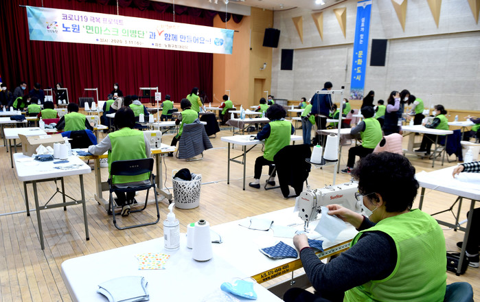 | ▲ 면 마스크 의병단이 주민들에게 전달할 마스크를 제작하고 있다. (사진제공=노원구청) |