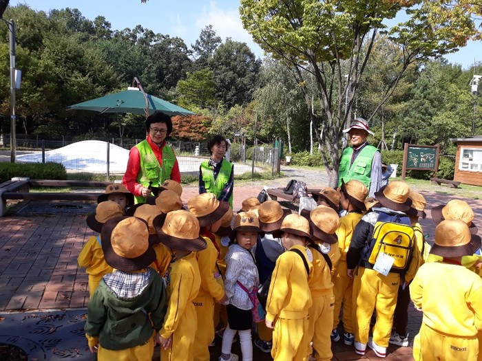 | ▲ 시립중랑노인종합복지관에서 일하는 노인들이 소풍 온 어린이들을 인솔하고 있다. (사진제공=중랑구청) |