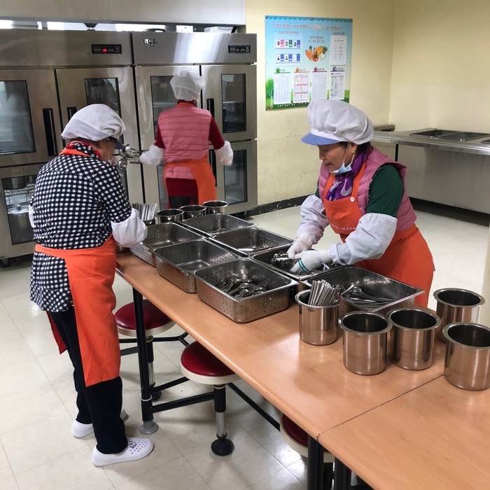 | ▲ 유린원광종합사회복지관에서 급식도우미로 일하는 노인들이 수저를 정리하고 있다. |