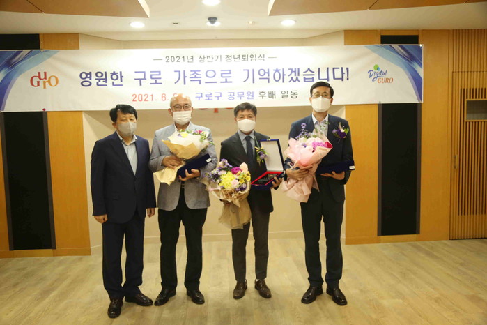 서울 구로구는 최근 '2021년 상반기 퇴임식'을 진행했다. 행사는 공로패 수여, 구청장 인사, 퇴임자 대표 답사, 기념촬영 순으로 진행됐다. 사진은 퇴임식에서 이성 구청장(왼쪽)과 퇴직자들이 기념촬영을 하는 모습. (사진제공=구로구청)