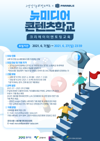 [고양=이기홍 기자] 고양시, 고양지식정보산업진흥원에서 운영하는 고양 경기문화창조허브에서 오는 6월 27일까지 “2021 고양 경기문화창조허브 × 패러블 엔터테인먼트 뉴미디어 콘텐츠 학교 - 크리에이터 멘토링 교육”에 참가할 크리에이터를 모집한다.