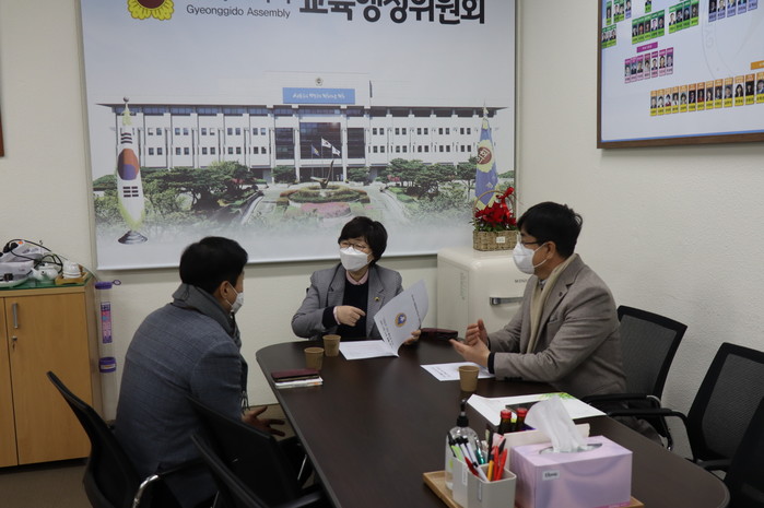 [수원=채종수 기자] 경기도의회 교육행정위원회 박옥분(더불어민주당, 수원2) 의원이 최근 위원회 회의실에서 경기도유치원연합회 관계자와 면담을 갖고 코로나19 긴급돌봄에 따른 급식비 지원 현실화 등 사립유치원 현안 사항에 대해 논의했다.