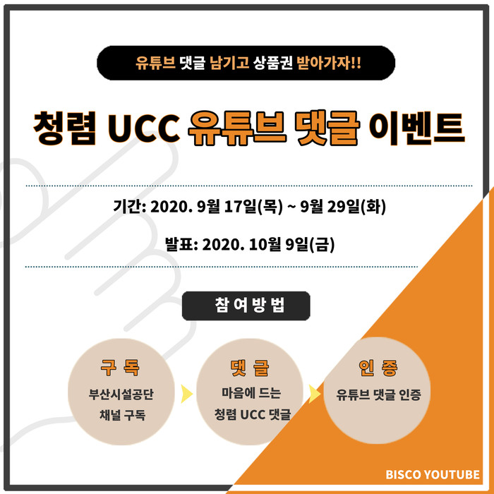 ‘청렴 UCC’ 시민 유튜브 반응도 심사는 청렴문화 확산을 위해 2020년 9월 17일(목)부터 9월 29일(화)까지 2주간 진행되며 유튜브 ‘부산시설공단’채널에서 참여할 수 있으며, 채널구독후 마음에 드는 청렴UCC에 댓글을 남기면 된다.