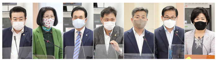 | ▲ (왼쪽부터) 박동웅 의장, 최숙자·이재만·박칠성·김영곤·정형주·노경숙 의원이 지난 10월21일 열린 제1차 상임위원회에서 제안설명을 하고 있다. (사진제공=구로구의회) |