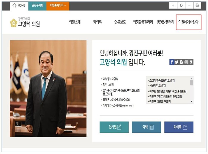 [시민일보 = 여영준 기자] 서울 광진구의회(의장 고양석)가 이달부터 의원별 홈페이지에 ‘의원에게 바란다’ 게시판을 신설하고 본격 운영에 들어갔다.