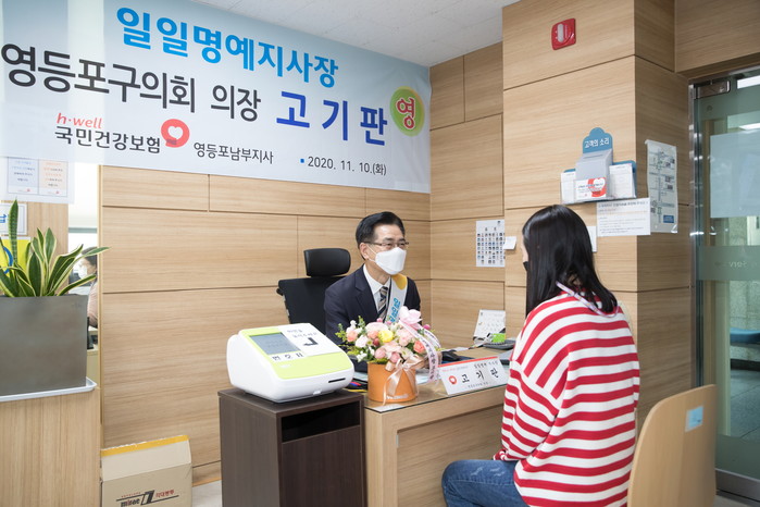 [시민일보 = 여영준 기자] 서울 영등포구의회 고기판 의장이 지난 10일 국민건강보험공단 영등포남부지사 일일명예지사장으로 위촉돼 현장 민원업무를 체험하는 시간을 보냈다.