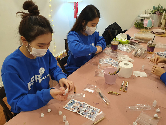 | ▲ 해바라기봉사단 4기 2조 단원들이 선물을 만드는 모습. (사진제공=bhc치킨) |