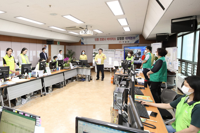 박동웅 서울 구로구의장이 최근 코로나19 확진자가 지속적으로 발생하고 있는 현 상황에서 최일선에서 근무 중인 보건소 의료진과 직원들을 격려하기 위해 구 보건소를 방문, 근무자들에게 간식을 전달하고 애로사항 등을 청취했다. 사진은 박 의장(가운데)이 보건소 직원들에게 격려의 말을 하고 있는 모습. (사진제공=구로구의회)