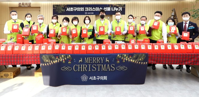 서울 서초구의회가 연말을 맞아 지역내 소외된 아이들에게 따뜻한 사랑을 전달하기 위해 크리스마스 선물꾸러미를 230개를 제작했다. 제작된 선물세트는 지역내 아동센터 9곳에 전달될 예정이다. 사진은 선물세트 제작 후 기념촬영을 하고 있는 구의원들의 모습. (사진제공=서초구의회)