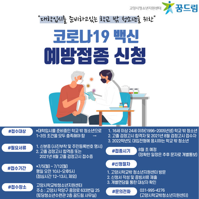 [고양=이기홍 기자] 재단법인 고양시청소년재단 산하 고양시학교밖청소년지원센터 꿈드림은 오는 12일까지 2022년 대입준비 학교 밖 청소년을 대상으로 코로나19 백신접종 신청을 받고 있다.