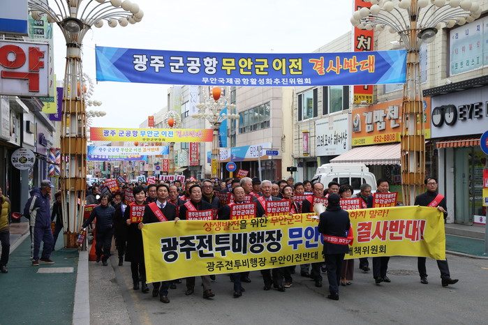 | ▲ 광주 군공항 무안군 이전을 반대하는 군민들과 단체들이 '광주전투비행장 무안이전 결사 반대'라는 플랜카드를 들고 길거리 행진을 하고 있다. (사진제공=무안군청) |