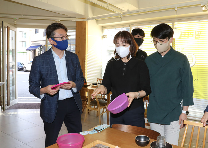이날 현장 방문은 이에 앞서 관련 사업을 시행 중인 현장을 찾아 관계자와의 간담회는 물론 사업에 동참 중인 업체, 다회용기 '배달-수거-세척' 과정 등 운영 전반을 둘러본 것이다.