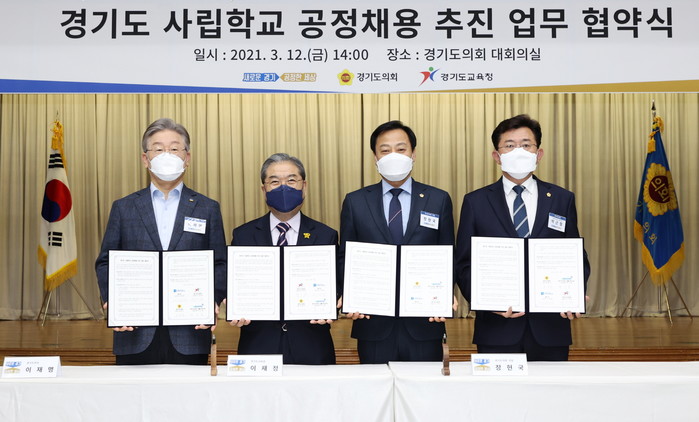 경기도의회가 최근 대회의실에서 도 및 도교육청과 '경기도 사립학교 공정채용 추진 업무협약식'을 열고 제도적 기반을 마련해 나가기로 뜻을 모았다. 사진은 (왼쪽부터) 이재명 도지사, 이재정 도교육감, 장현국 의장, 박근철 대표위원이 협약서를 들고 기념촬영을 하는 모습. (사진제공=경기도의회)