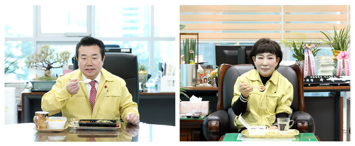 | ▲ 제298회 정례회 회기 중인 1일, 박동웅 의장(왼쪽)과 곽윤희 부의장이 도시락으로 점심식사를 하고 있다. (사진제공=구로구의회) |