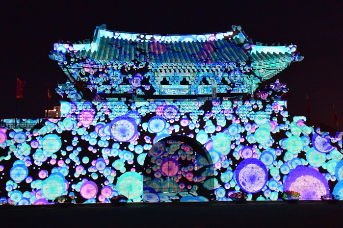 진주시는 지난 8일 저녁 진주성 촉석문 성벽에 미디어파사드 연출을 시연하였다. 미디어파사드는 건물 외벽에 LED 조명을 비추어 영상을 표현하는 기법으로 환상적인 빛의 연금술이다.
